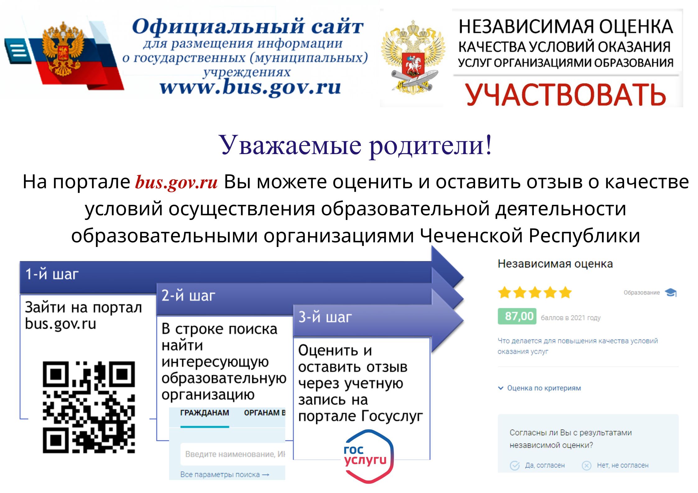 На портале bus.gov.ru Вы можете оценить и оставить отзыв о качетсве условий осуществления образовательной деятельности образовательными организациями Чеченской Республики